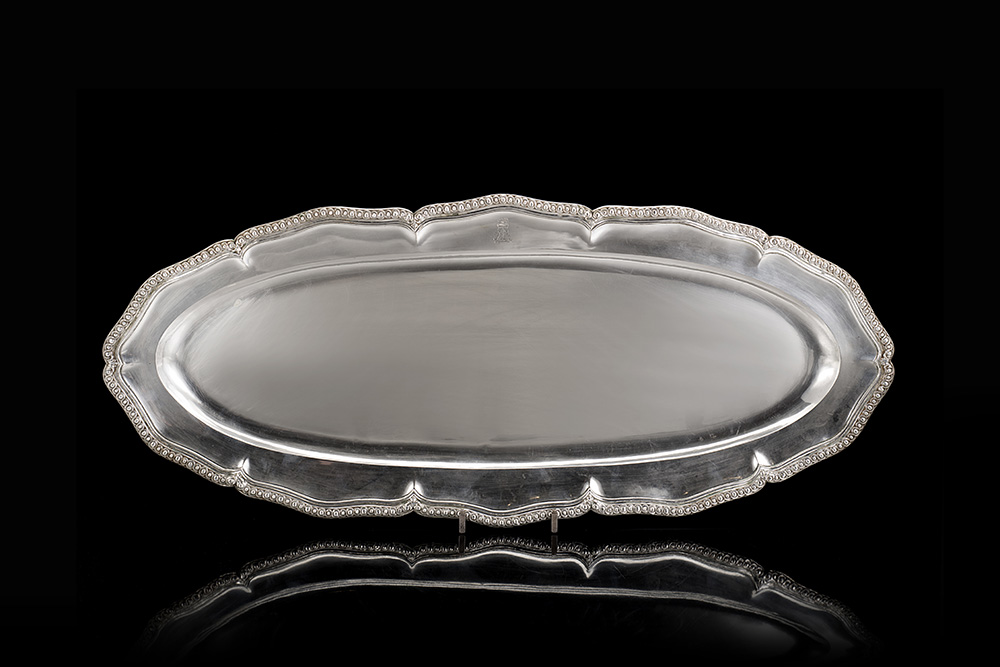 Pescera in argento di forma ovale sagomata con bordura decorata a perle e nastri intrecciati, e tesa incisa con monogramma della famiglia Melzi. Milano, seconda metà secolo XIX, argentiere Francesco Ceppi (cm 81x34,5 ca.) (g 1950 ca.) (lievi difetti)