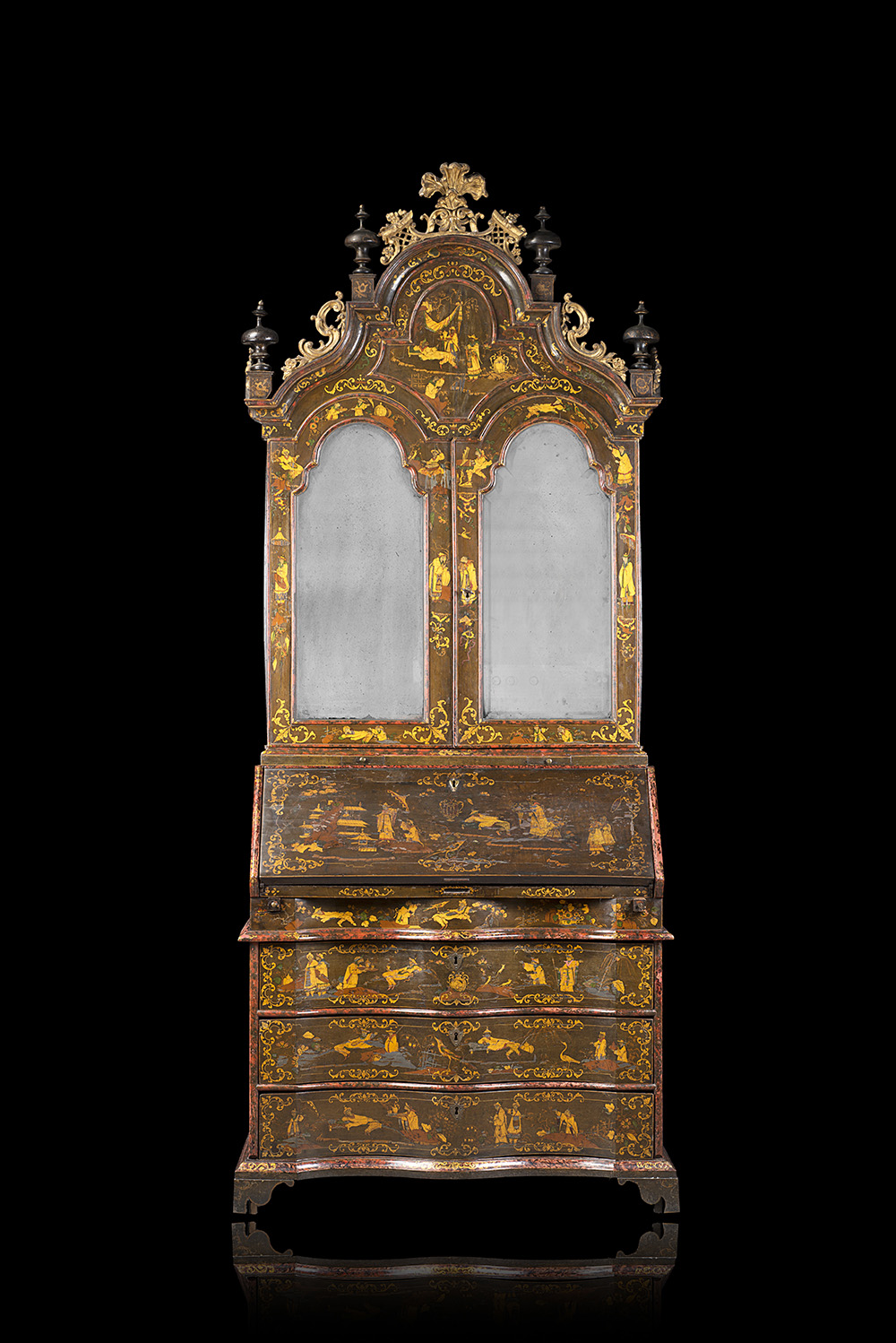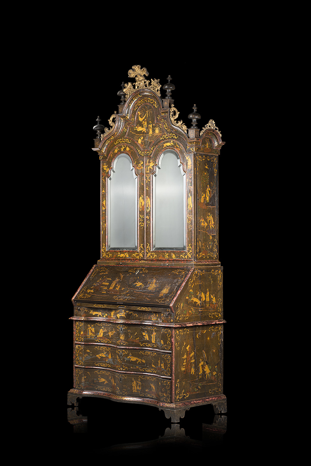 A chinoiserie and faux tortoiseshell lacquered bureau-cabinet. Veneto, 18th century (cm 108x288x61) (defects)
