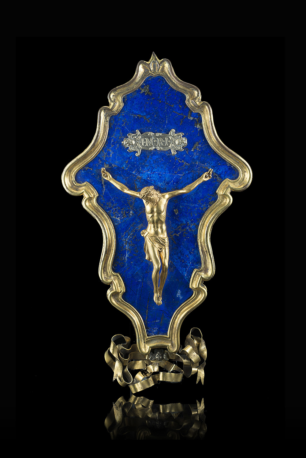 Cristo crocifisso in bronzo dorato su pannello lastronato in lapislazzuli entro cornice in bronzo dorato di forma mossa terminante con nastro centrato da cherubino. Secolo XVIII (cm 31x19) (difetti)