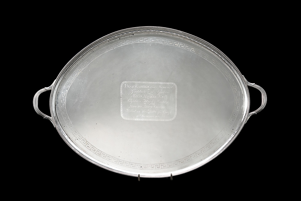 Vassoio biansato in argento con bordo decorato a motivi concatenati e greche. Cavetto inscritto e dedicato al capitano Hugh Mac Kay, caduto nella battaglia di Assaye 23/9/1803. Argentieri Robert and Samuel Hennel (g 3900 ca.)