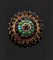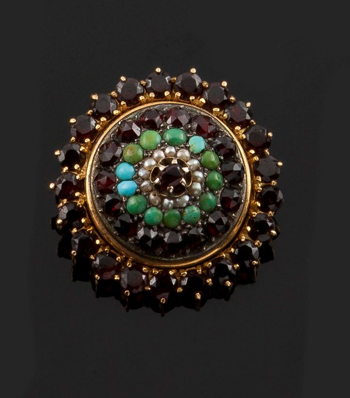 Spilla in oro giallo, di forma circolare, con doppio contorno di granati taglio rotondo e