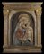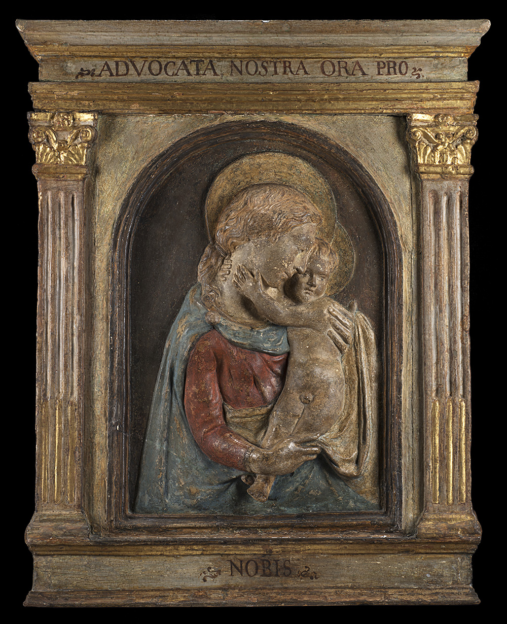 "Madonna col Bambino, del tipo detto Madonna Massimo" 1425/30 ca. Bassorilievo centinato in stucco dipinto (cm 62,5x45) Tabernacolo architettonico in legno dipinto (cm 90x73,5x12,5) (lievi difetti)