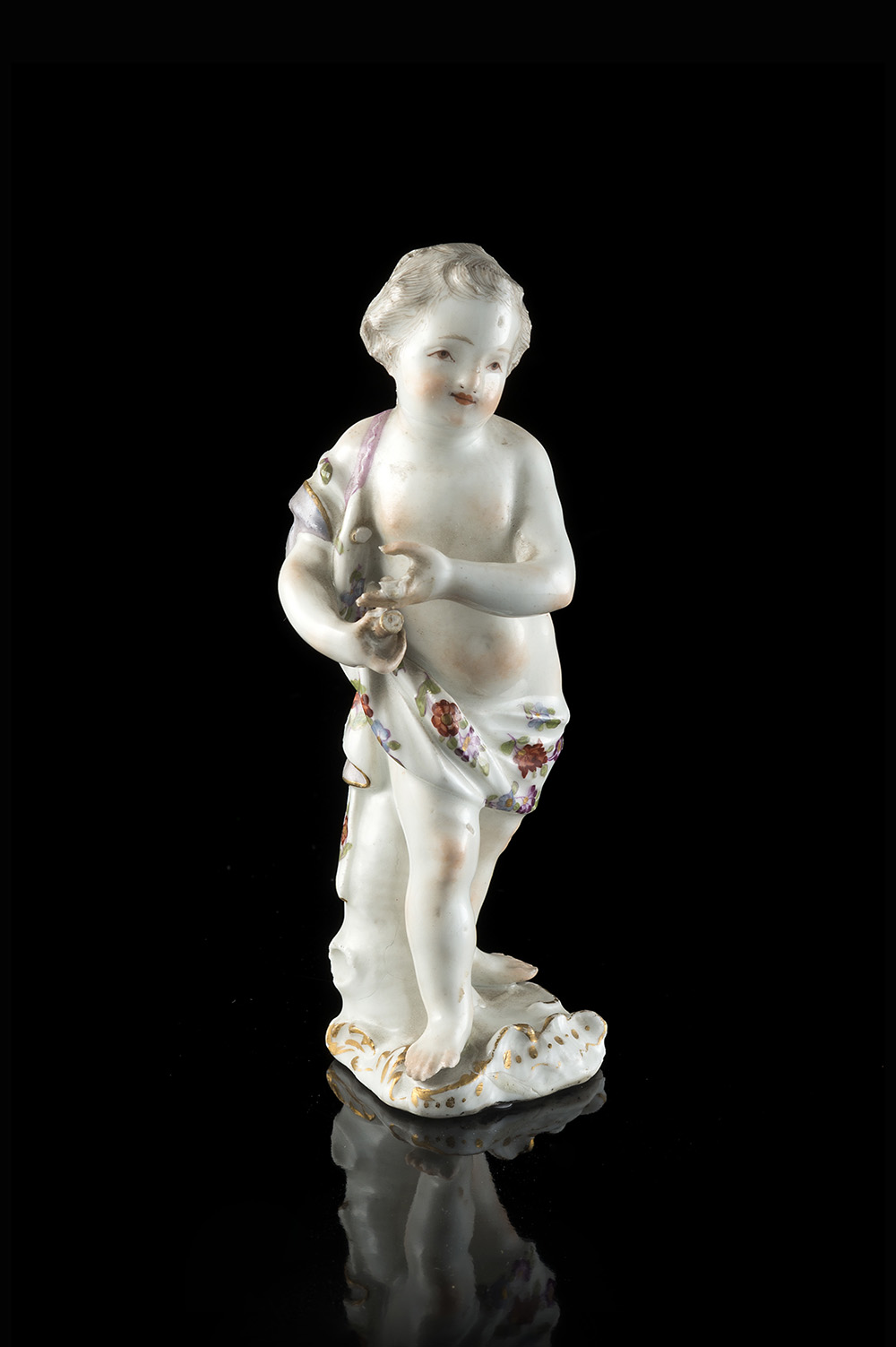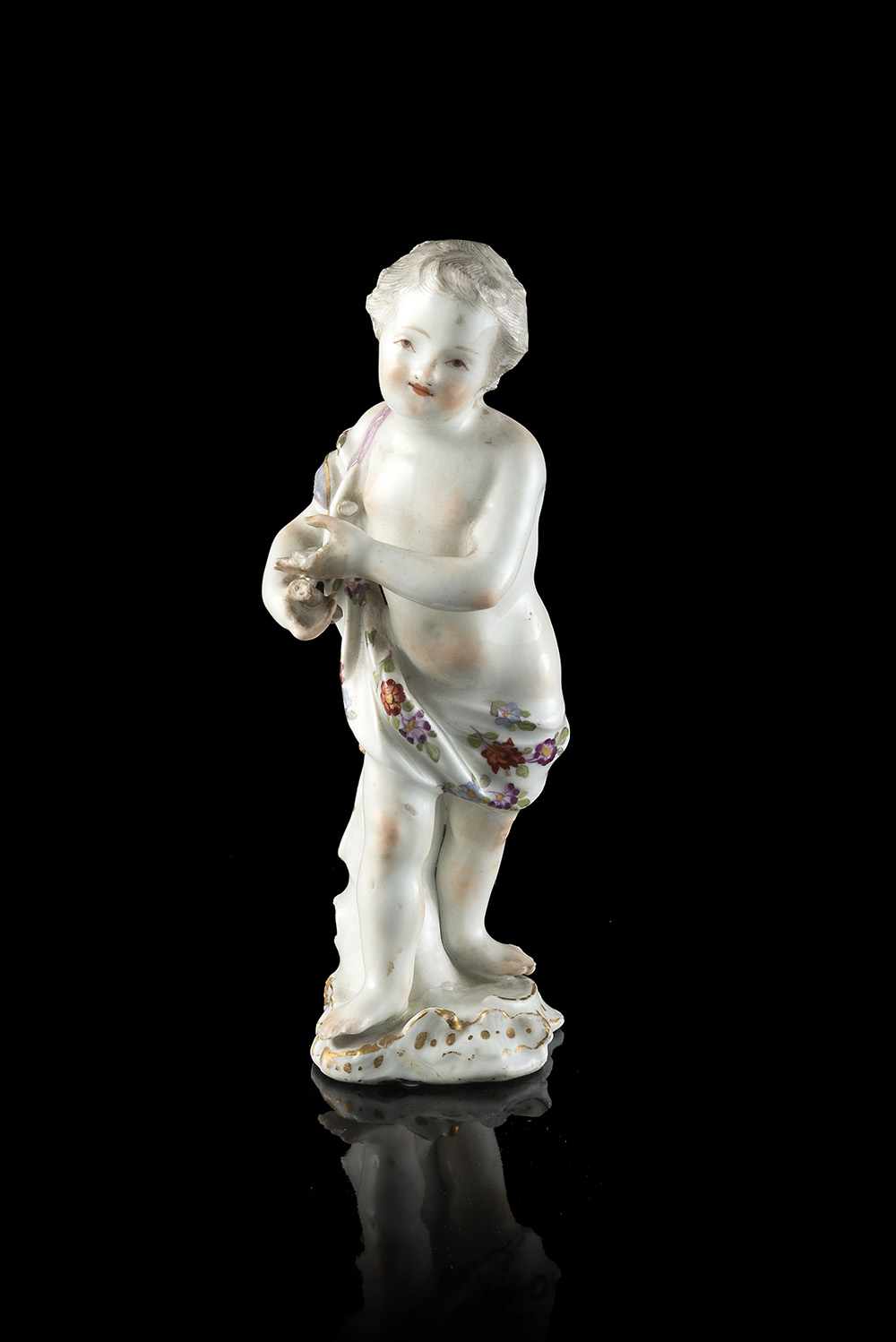18th-century manufacture "Putto" polychrome porcelain sculpture (h. cm 12) (defects and losses)
