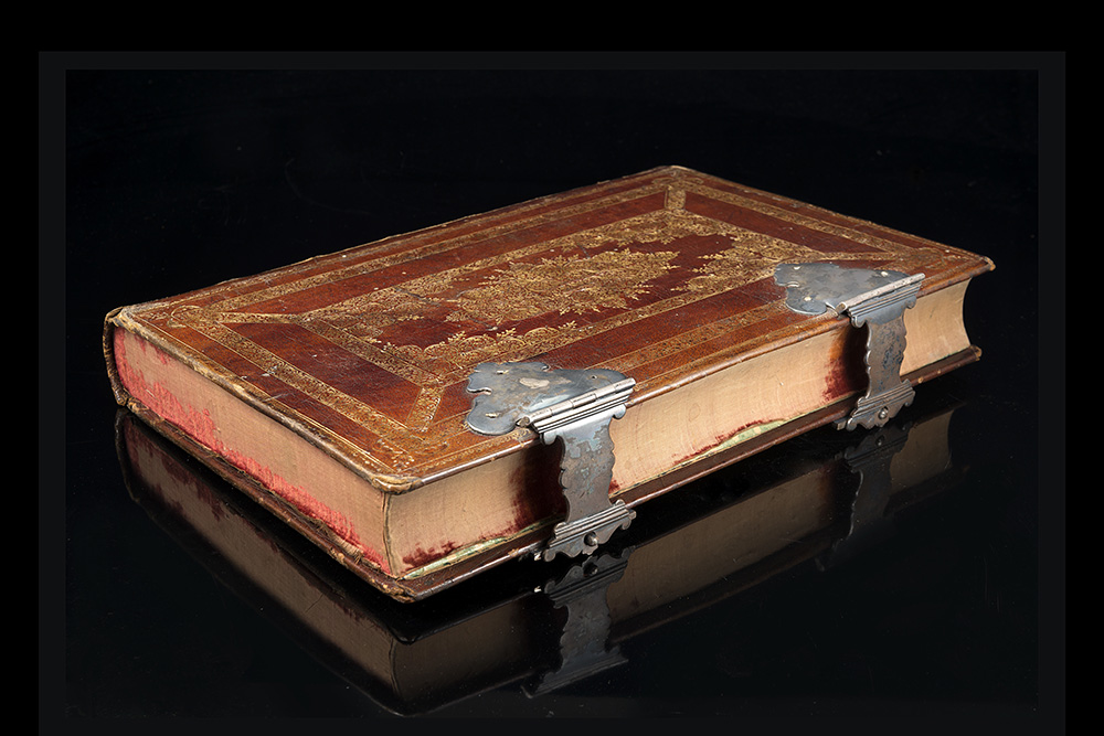 Scatola a finto libro in pelle impressa in oro con ghiere in argento. Secolo...