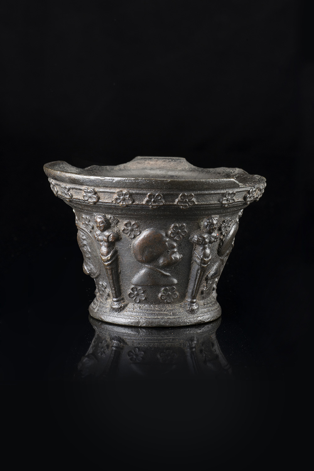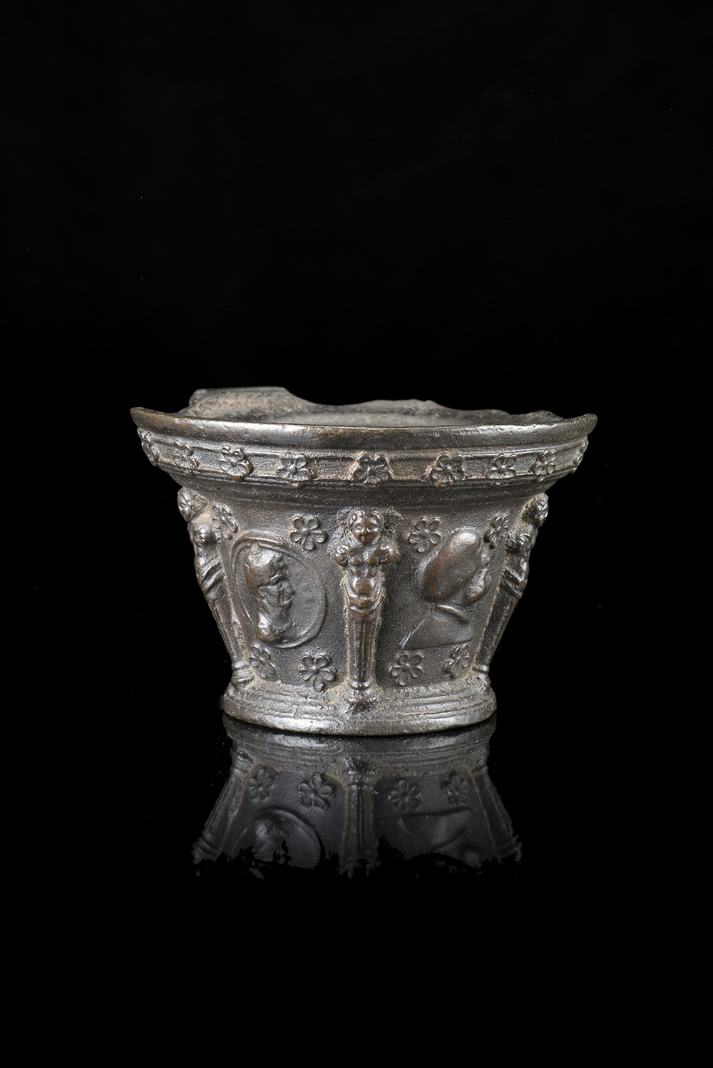 Mortaio in bronzo decorato a profili intervallati da cariatidi e fiori. Secolo XVI (h. cm 7) (difetti e mancanze)