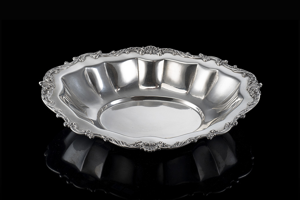 Centrotavola in argento di forma ovale sagomata, con sponda baccellata e bordura a volute fogliate e conchiglie. Italia, anni '30/'40 del secolo XX. Marchio del Fascio (cm 33x26 ca.) (g 630 ca.)