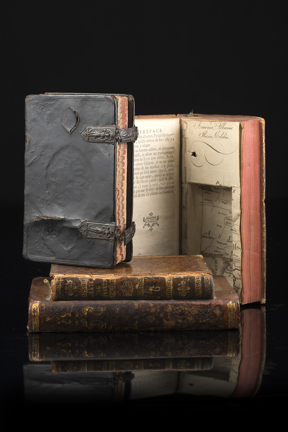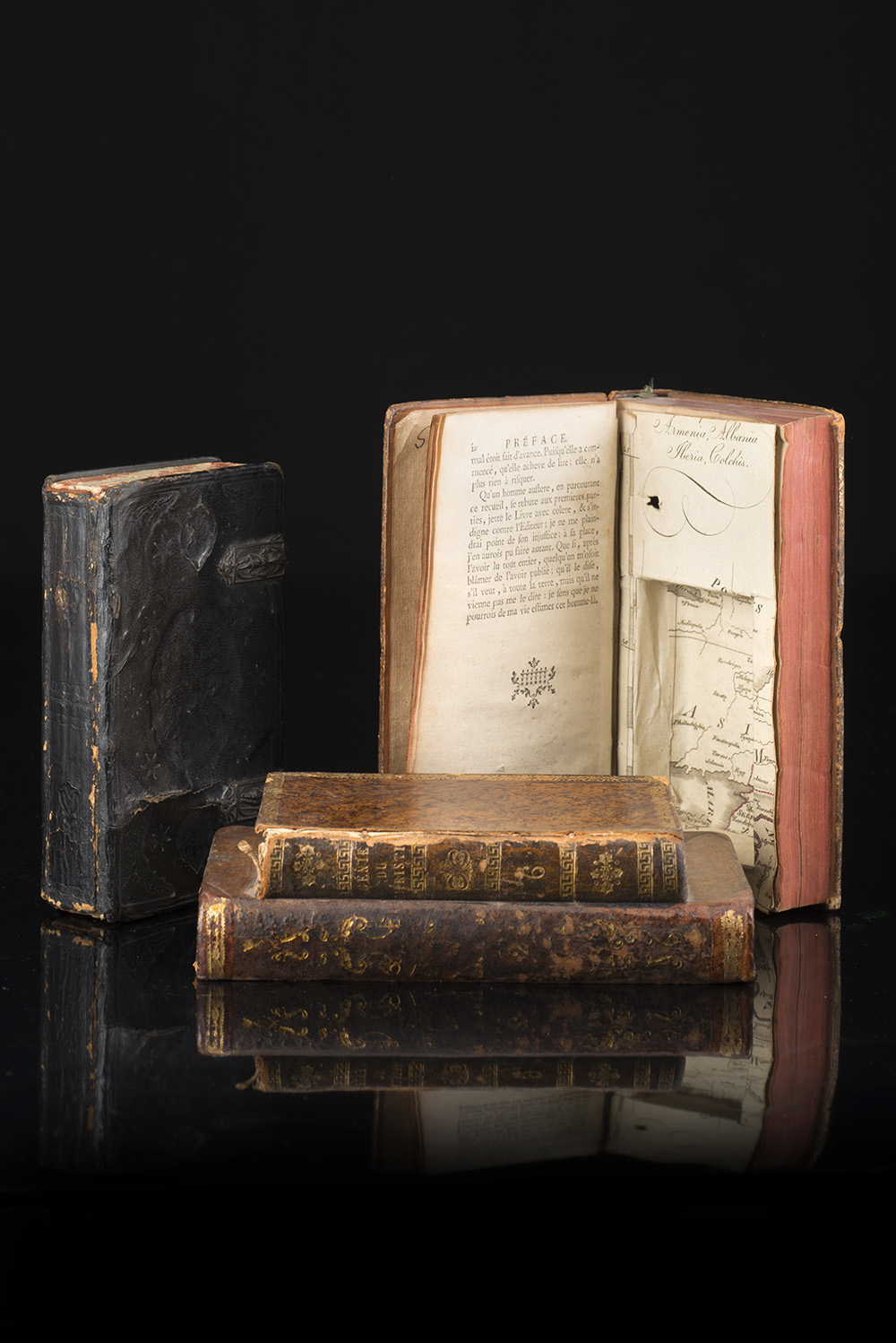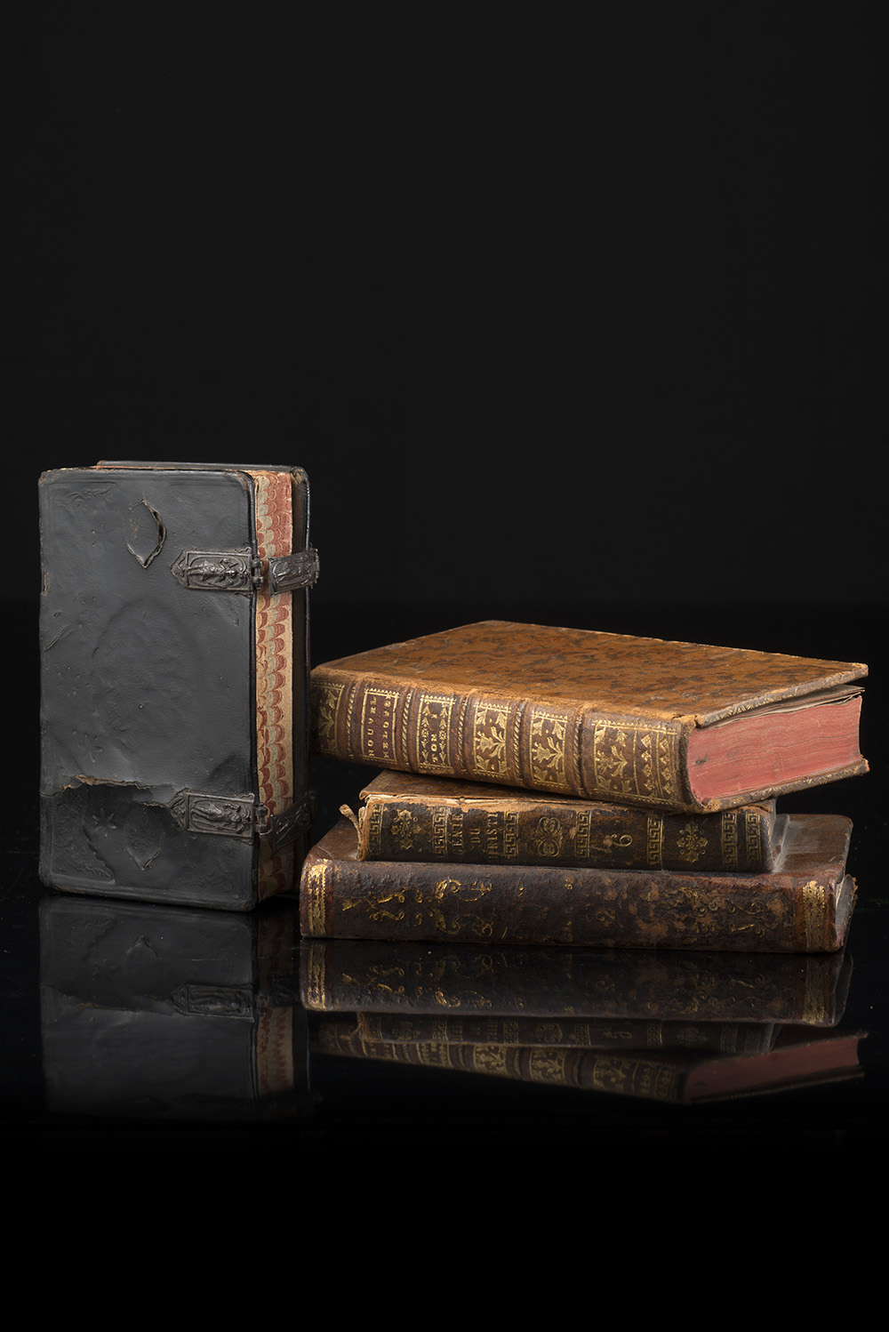 Lotto composto da quattro scatole a finti libri con legature in pelle impressa in oro e piena pelle. Una con carillon ed una con etichetta di provenienza Gianetti, Milano (difetti)