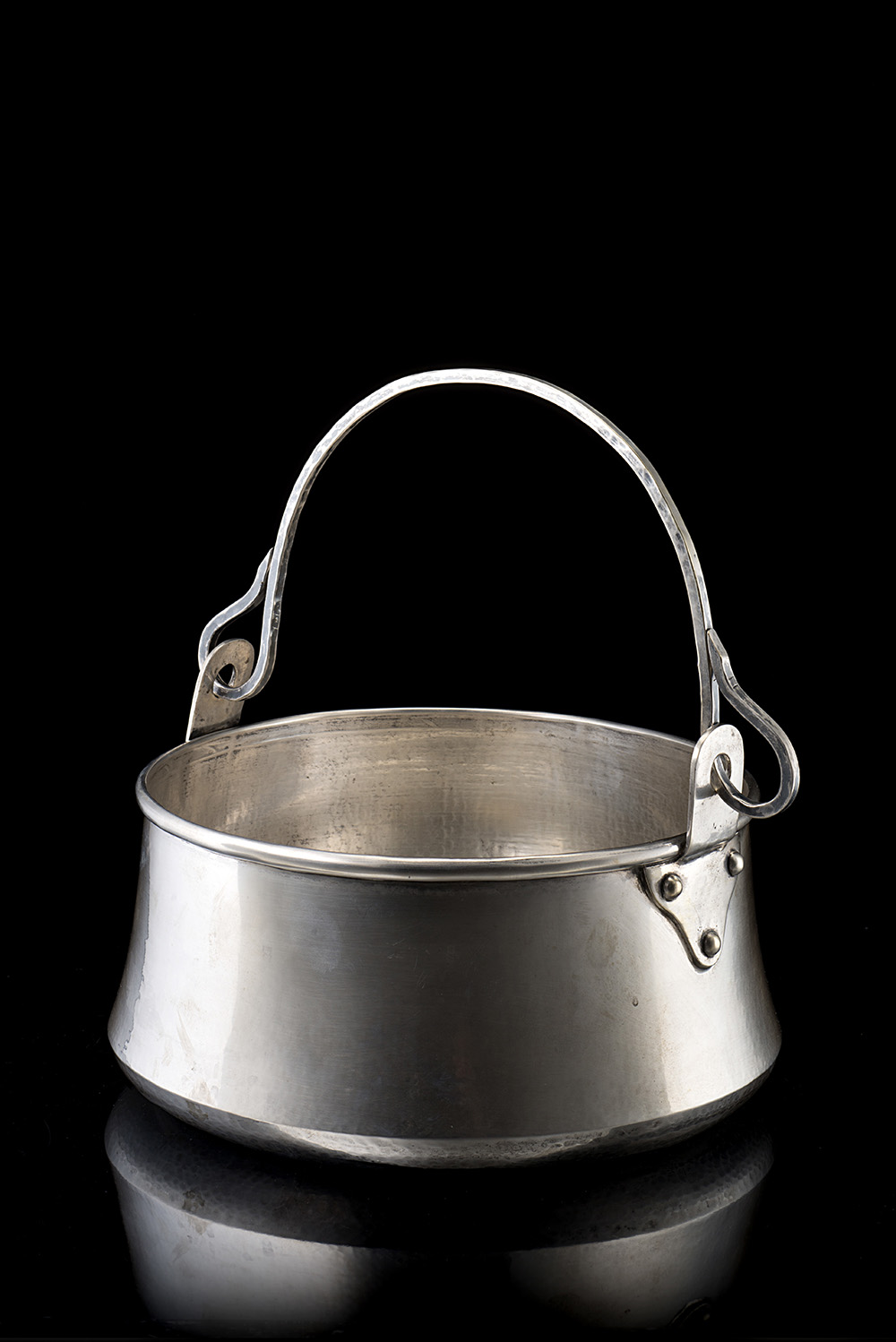 Paiolo in argento di forma circolare con superficie leggermente martelé e manico ad arco. Italia, secolo XX (h. cm 15 ca.) (g 1265 ca.) (lievi difetti)