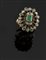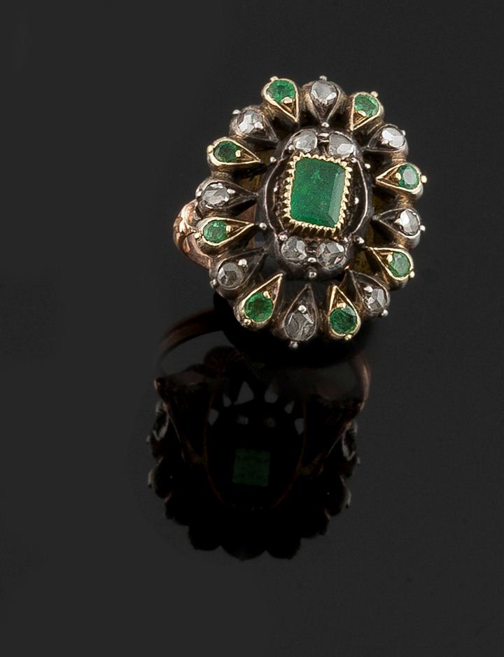 Anello in oro giallo a basso titolo ed argento, al centro smeraldo di taglio rettangolare, circondato