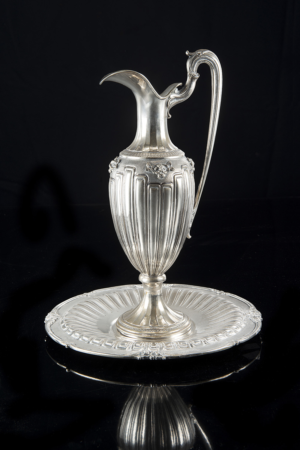 Acquamanile con vassoio in argento decorato a rilievo a mazzi di fiori e...