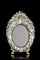 Specchio di forma ovale con cornice decorata in pasta di vetro e vetro a foglie, fiori e perlinature. Cimasa centrata da cartella con specchio inciso. Piedi in legno intagliato e dorato. Veneto, seconda metà del secolo XIX (h. cm 80) (difetti e mancanze)