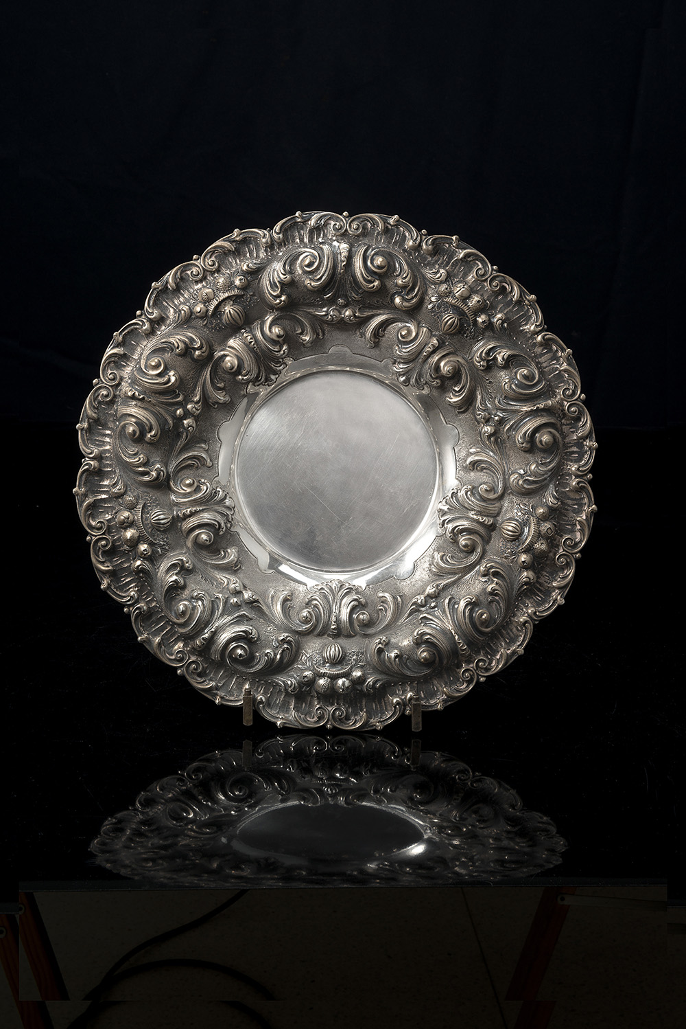 Alzata in argento sbalzata e cesellata nel bordo a volute fogliate e vasi con frutti. Titolo 800. Italia, 1930 ca. (d. cm 34) (g 1000 ca.) (lievi difetti)