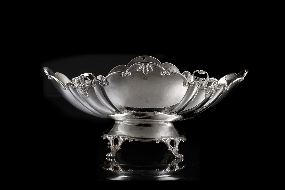 Alzata centrotavola in argento di forma ovale baccellata con bordo sagomato...
