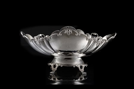 Alzata centrotavola in argento di forma ovale baccellata con bordo sagomato decorato a volute e motivi fogliati. Italia, metà secolo XX (cm 39,5x24x18 ca.) (g 1050 ca.)