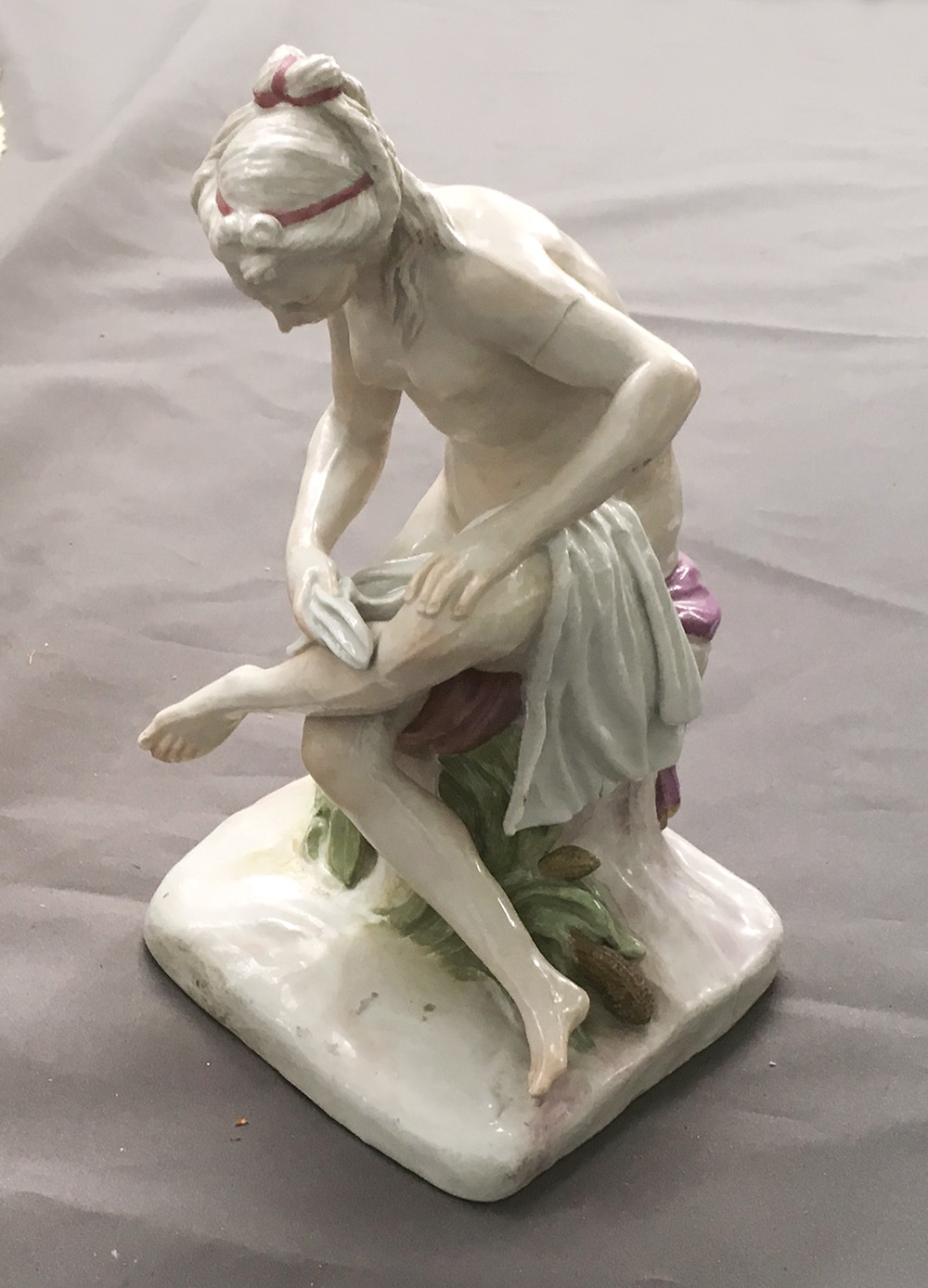 Manifattura del secolo XIX "Venere al bagno" scultura in porcellana policroma (h. cm 18) Firma incisa alla base (difetti)