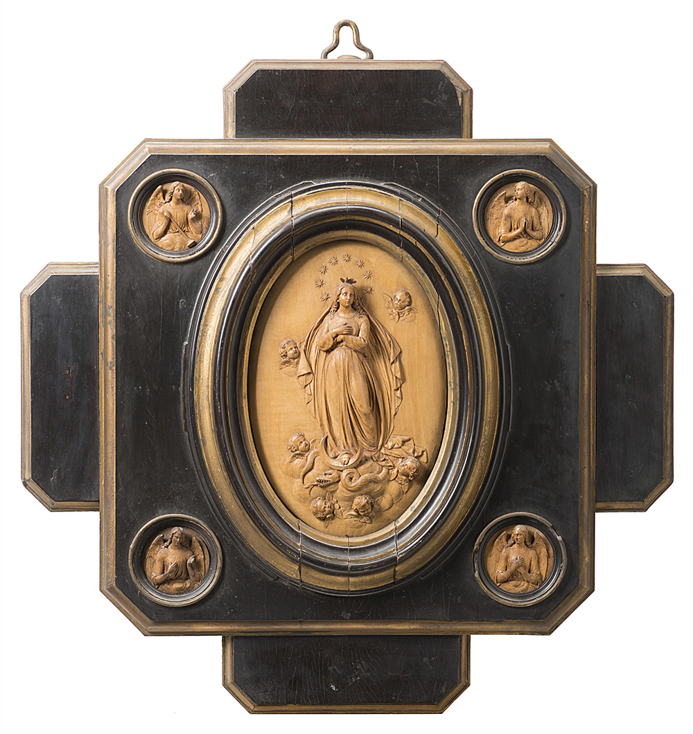 Scultore del secolo XIX "Immacolata fra angeli" cornice a croce greca...