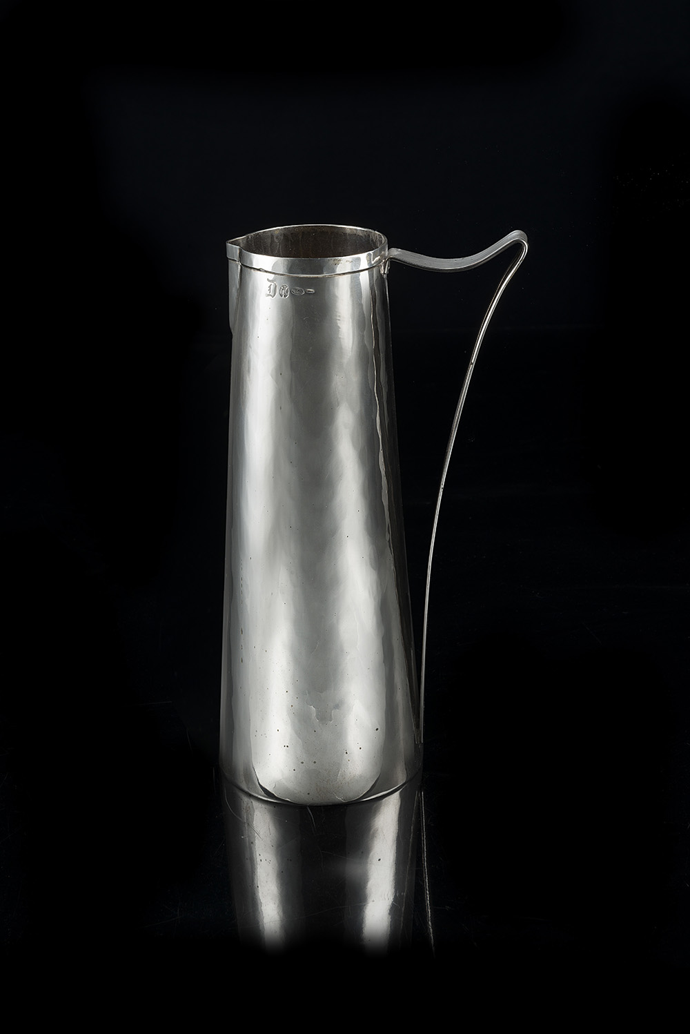 Brocca in argento martellato a copro liscio con ansa sagomata. Punzoni Fratelli Calegaro. Titolo 800 (h. cm 28) (g 550 ca.)