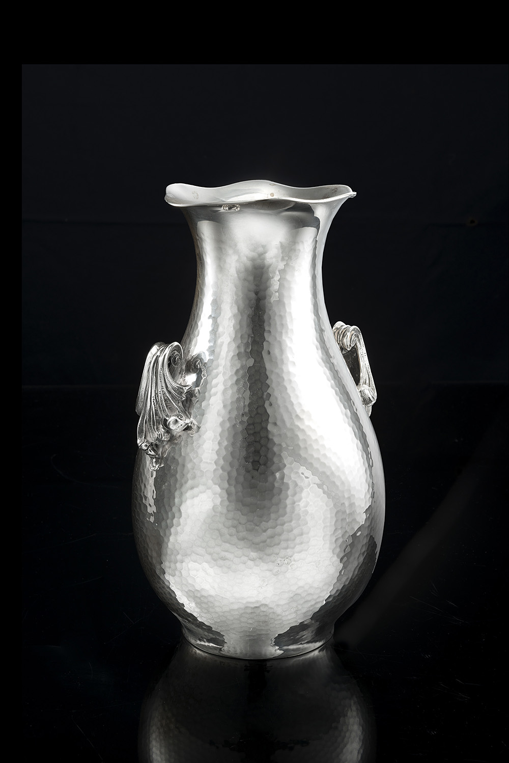 Vaso biansato in argento a corpo martellato. Anse in rilievo a volute....
