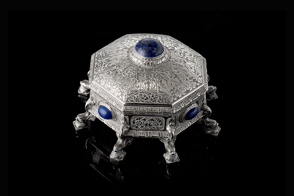 Scatola portagioie in argento di forma ottagonale sorretta da otto piedini in...
