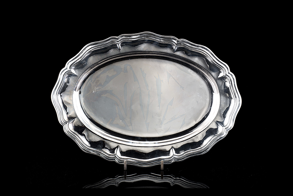 Vassoio di forma ovale in argento con bordo mistilineo (d. cm 47,5) (g 1100 ca.)