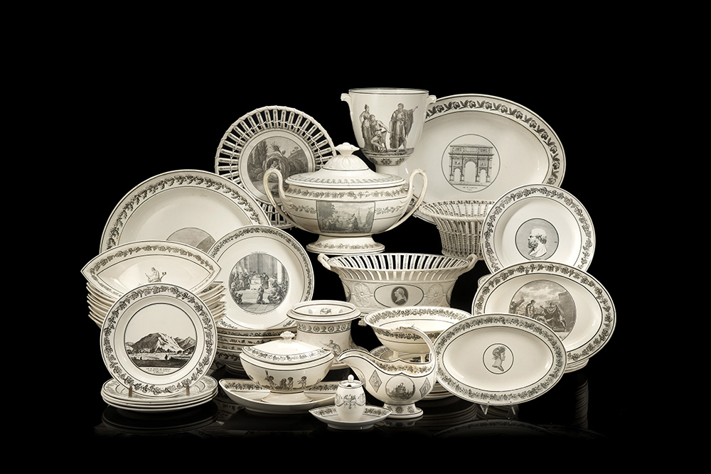 Manifattura di Stone Coquerel et Legros, Parigi, secolo XIX / XX. Lotto composto da due parti di servizi in terraglia color crema decorati a motivi classici, scene storiche, illustrazioni di fiabe e personaggi della nobiltà europea. Composto da: tre zuppiere, tre salsiere, due senapiere, due alzate, un vaso biansato, sei ciotole, quaranta piatti da portata e centocinquanta piatti di misure diverse (difetti)