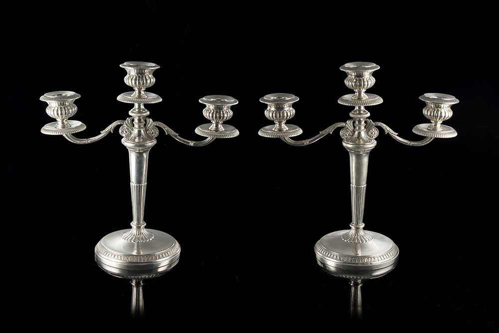 A pair of three-flames silver candelabras (h. cm 27) (g 1250 ca.)