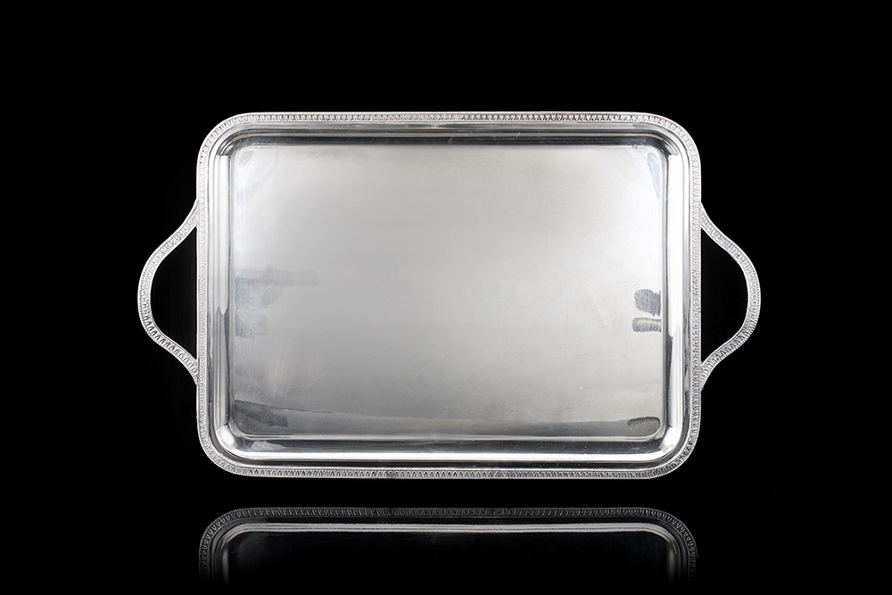 Vassoio biansato in argento con bordi di forma rettangolare e prese incise a palmette (cm 49,5) (g 1190 ca.) (difetti)