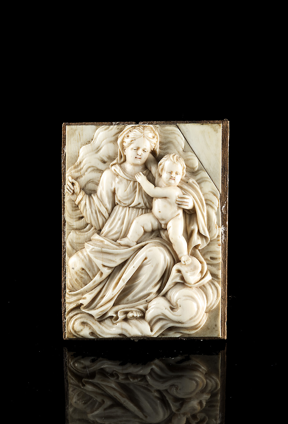 Early 19th-century art "Virgin and Child" ivory high relief (cm 8x5,5) On wooden panel (defects)