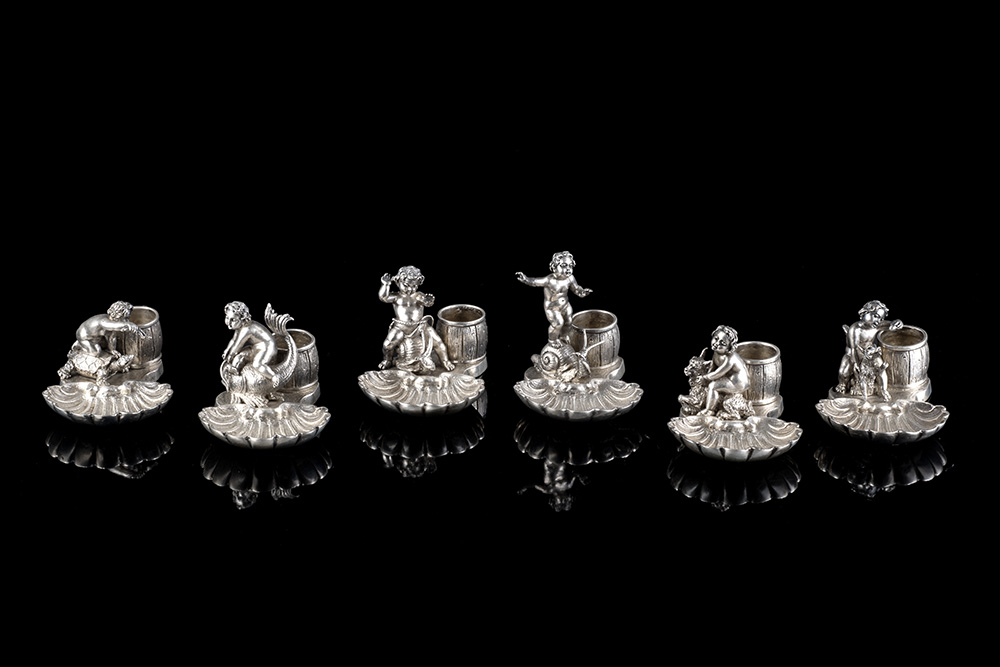 Sei segnaposto in argento raffiguranti putti giocosi su animali, con vaschette porta sale a forma di conchiglia e contenitori porta stuzzicadenti a forma di botte. Italia, secolo XX (cm 8x8,5 ca.) (g 890 ca.) (lievi difetti)