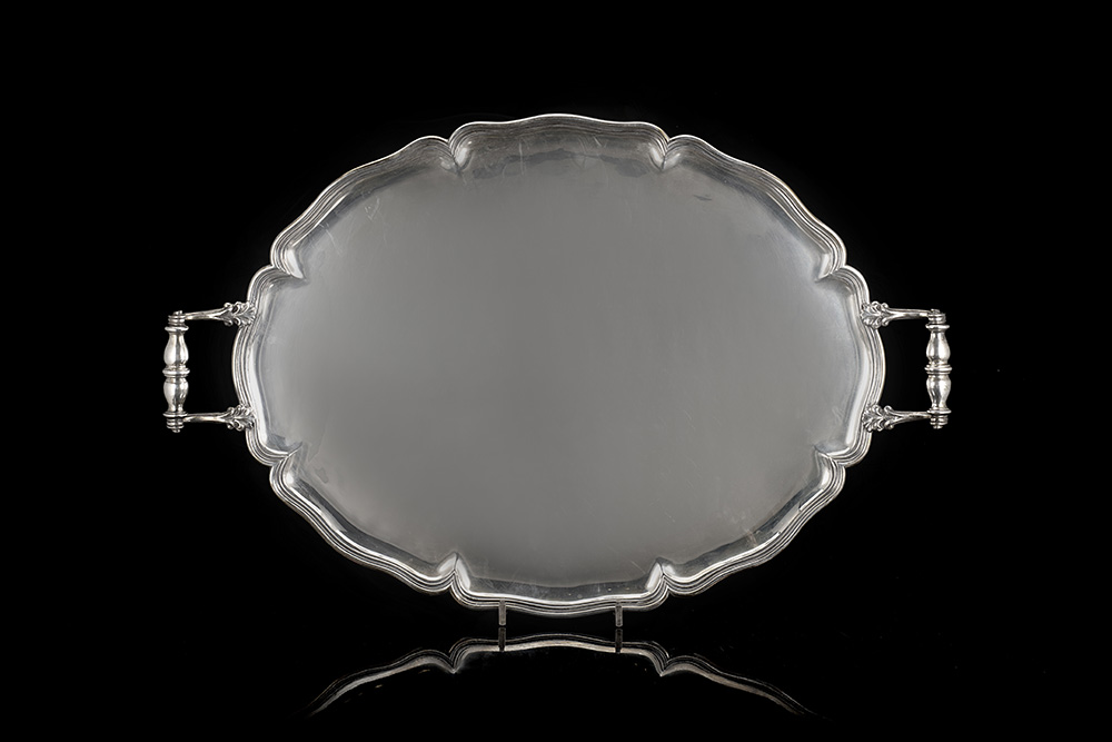 Vassoio in argento di forma ovale sagomata con bordura modanata e manici a battente con attacchi fogliati. Italia, inizi secolo XX (cm 71x46 ca.) (g 2530 ca.) (lievi difetti)