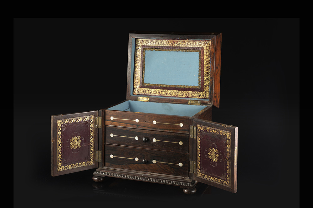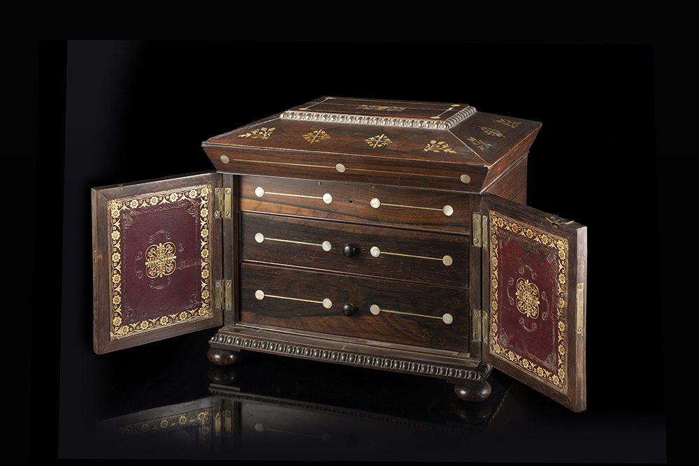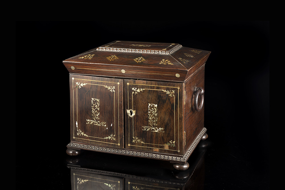 Portagioie in palissandro intarsiato in madreperla a motivi floreali. Fronte a due sportelli celanti cassetti. Coperchio a urna sollevabile (cm 30x26x23) Fine secolo XIX (difetti e mancanze)