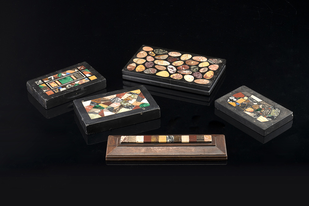 Arte del secolo XIX / XX. Gruppo di cinque presse papier in commessi di marmo, uno su base in legno (difetti)