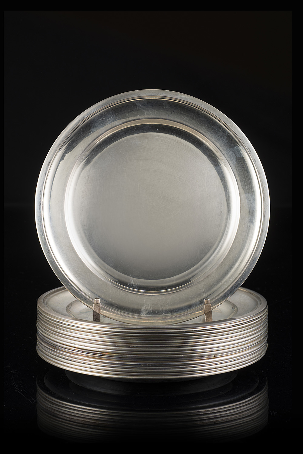 Lotto di sedici piatti in argento di forma circolare con superficie liscia. Italia metà XX secolo, dodici marcati Miracoli (d. cm 20 ca.) (g tot. 4000 ca.)