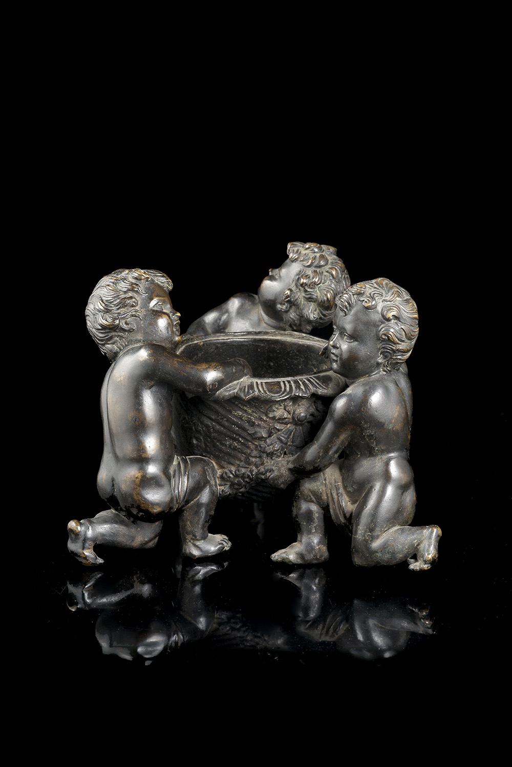Antico calamaio in bronzo con vasca sorretta da putti e decorata a festoni e mascheroni (h. cm 13,5) (difetti)