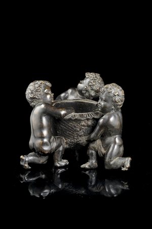 Antico calamaio in bronzo con vasca sorretta da putti e decorata a festoni e...