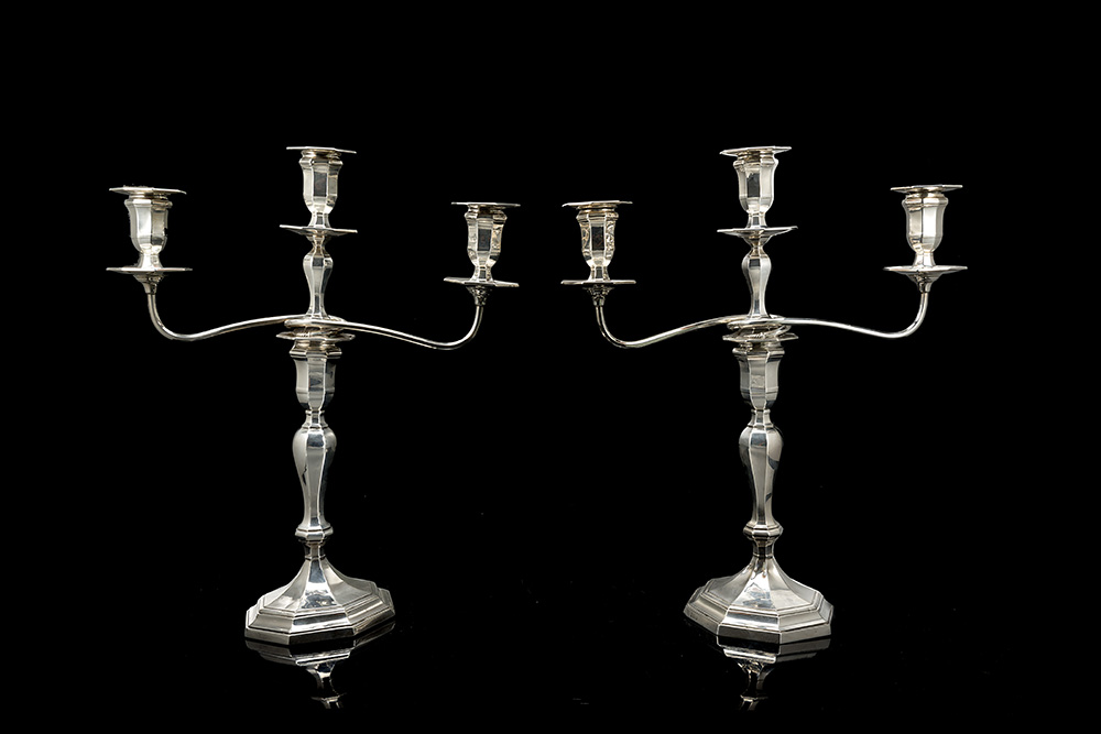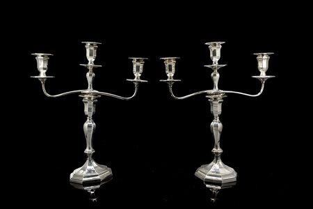 A pair of three-flames candelabras. London marks, early 20th Centur (groos g 4100 ca.) (defects)