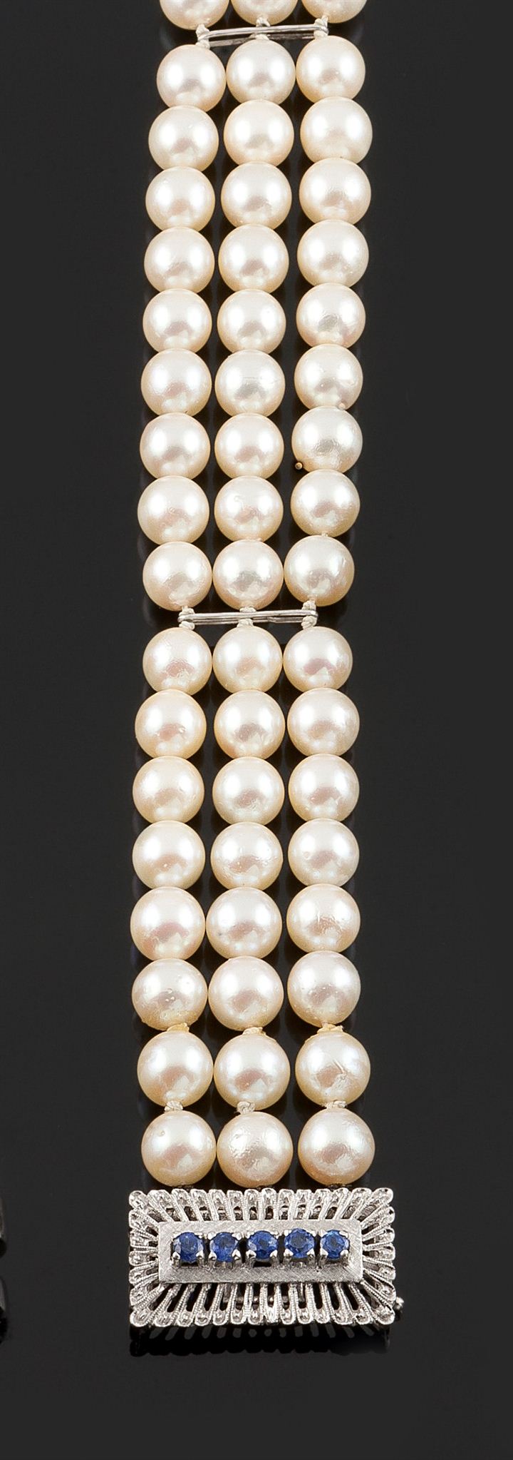 Bracciale composto da tre fili di perle dal diam di mm 5,8 a 6,1; chiusura e distanziali in oro bianco con