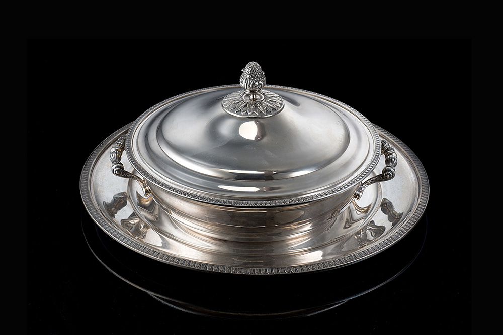 Legumiera con vassoio in argento, di forma circolare liscia decorata da...