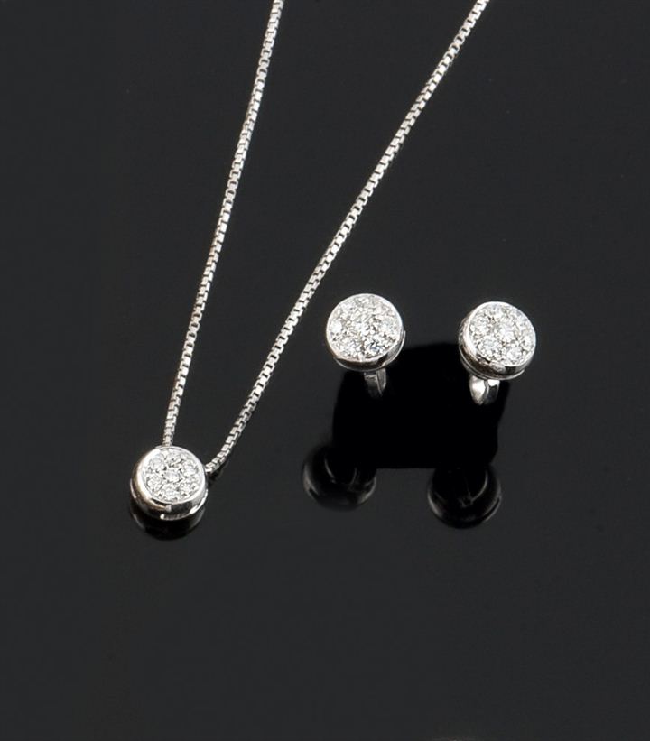 Demi-parure in oro bianco composta da una collana trattenente un punto luce con diamanti