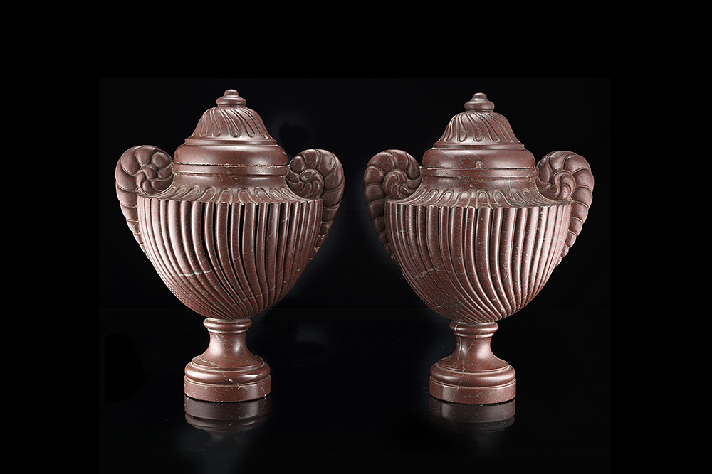 Coppia di vasi biansati con coperchio in marmo rosso. Corpo a spirale e basi tornite (h. cm 43) (difetti)