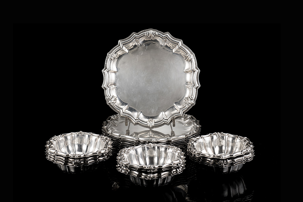 A silver set composed of twelve silver plates and twelve bowls. Milan, Silversmith Miracoli (g 4500 ca.)