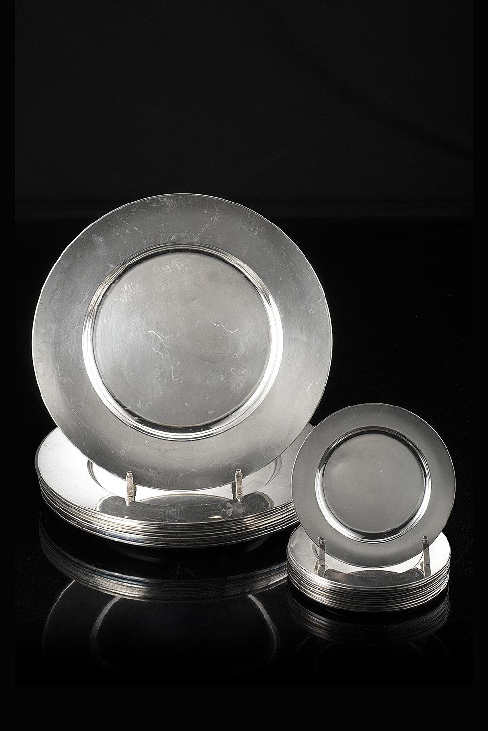 A lot of twelve circular silver saucers. Italy, mid-20th Century (d. cm 15 ca.) (tot g 1330 ca.) (minor defects) with ten silver circular plates (d. cm 30 ca.) (g tot. 4750 ca.) (minor defects)