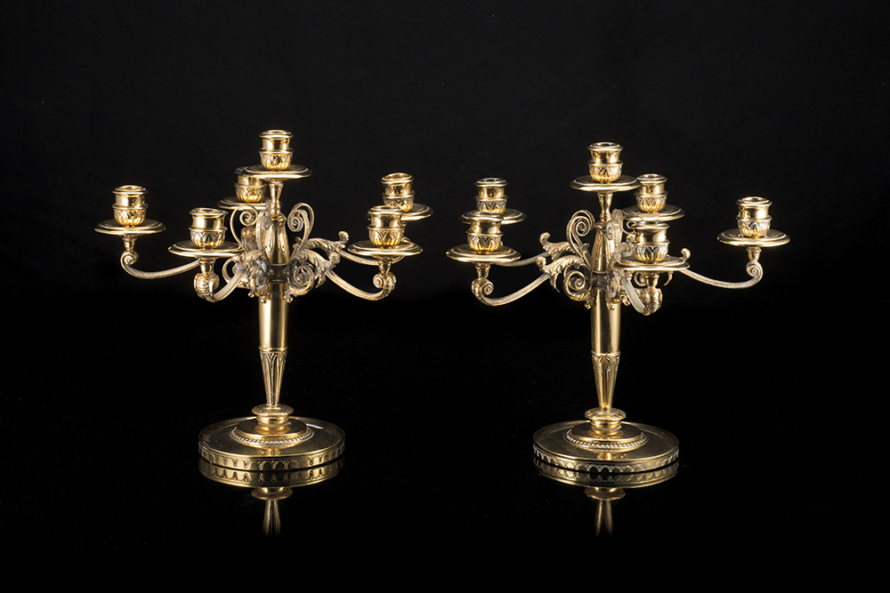 Coppia di candelabri in argento dorato a sei fiamme, con base circolare e...