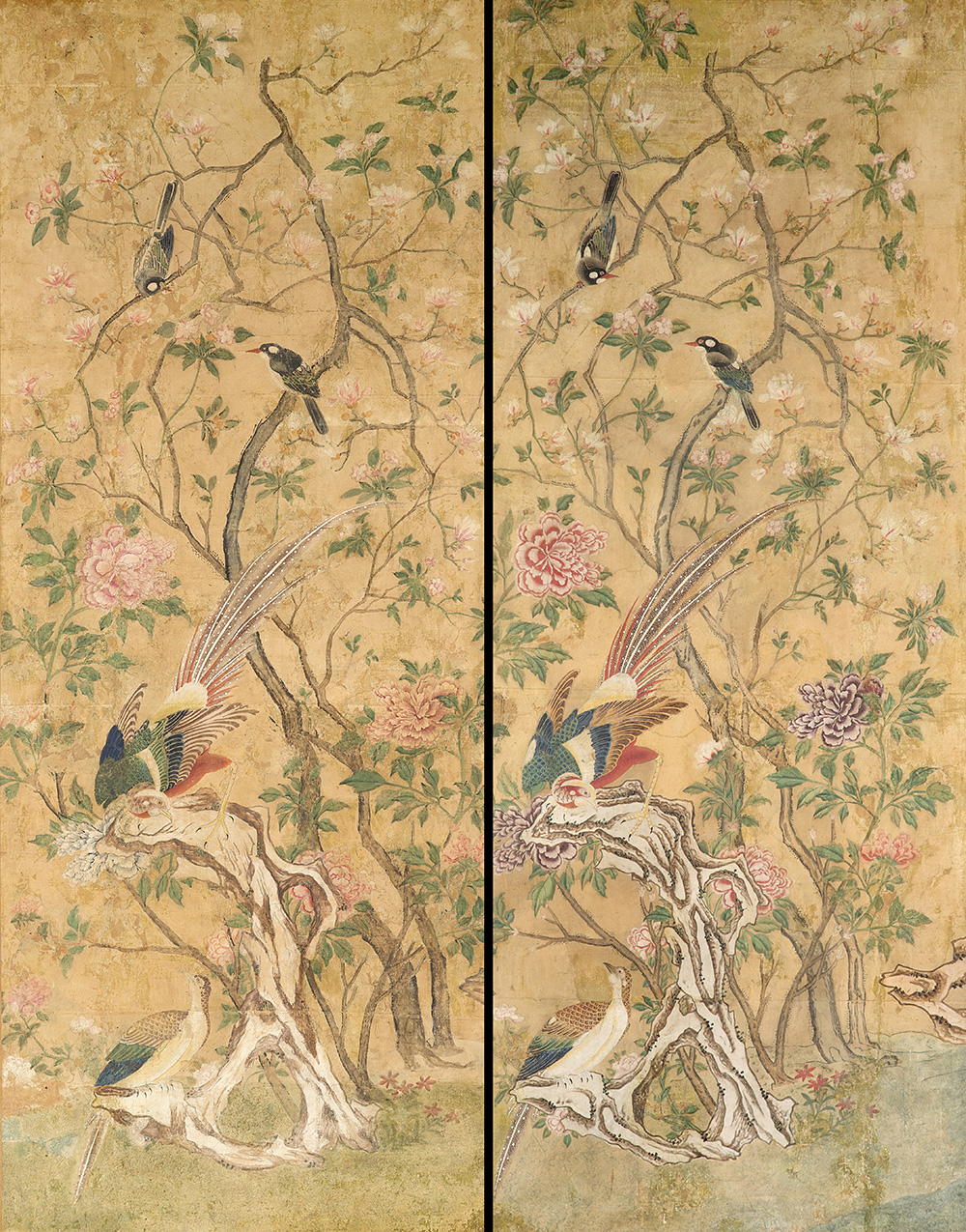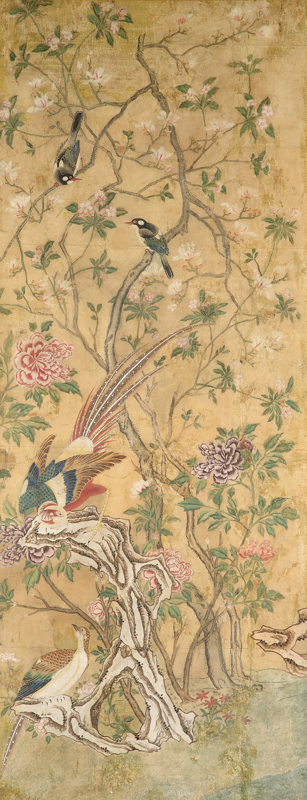 Coppia di papier peint applicati su tela raffiguranti volatili su rami fioriti. Piemonte, secolo XVIII (cm 245x94,5) (difetti e restauri)