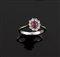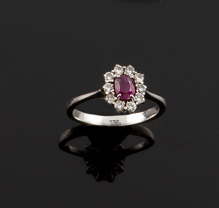 Anello in oro bianco a forma di fiore, con al centro rubino di taglio ovale contornato da dieci diamanti taglio 8/8 per complessivi ct 0,40 ca