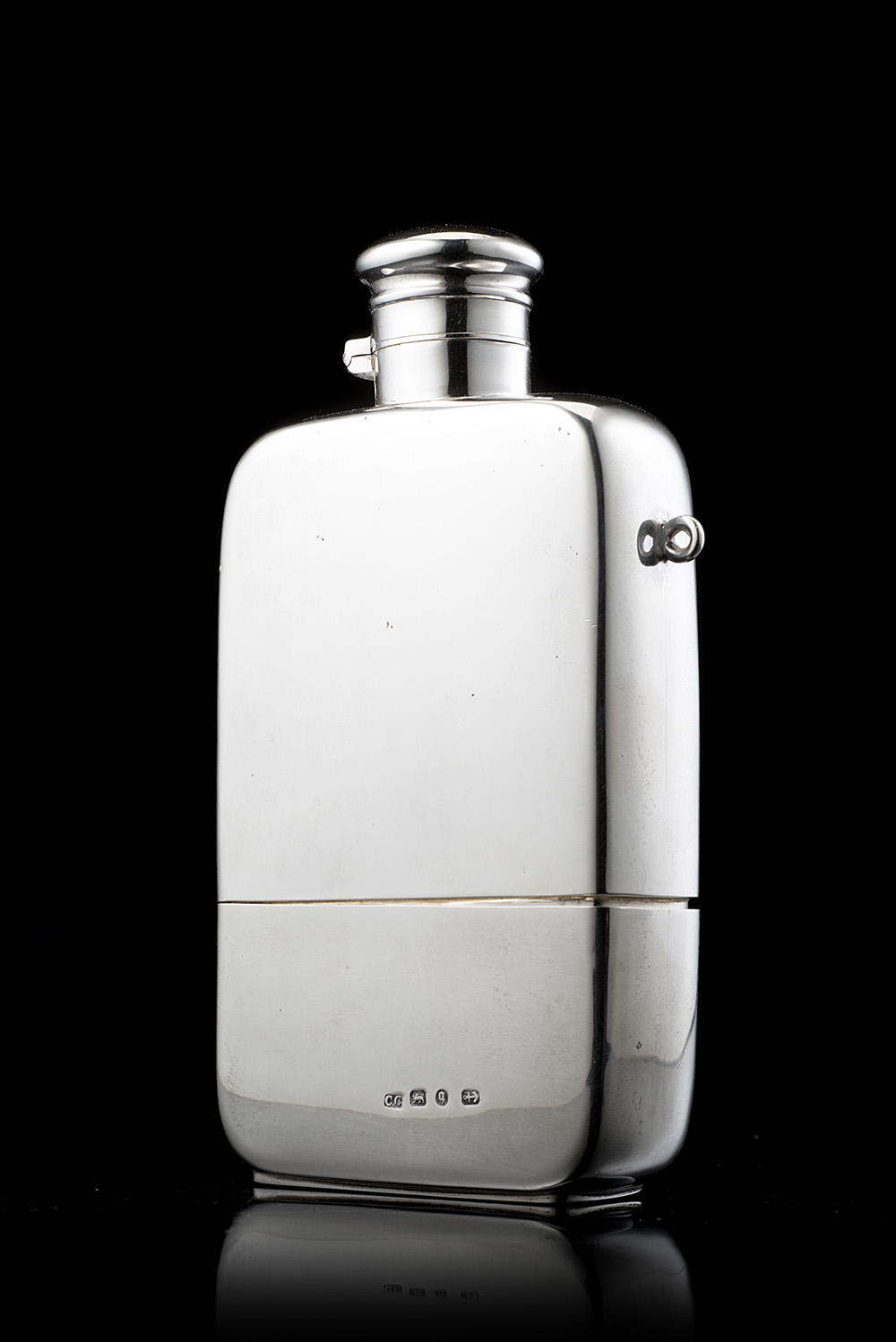 Fiasca in argento di forma rettangolare con superficie liscia e bicchiere estraibile. Birmingham, 1890 (h. max cm 15x7,5) (g lordi 250 ca.) (difetti)
