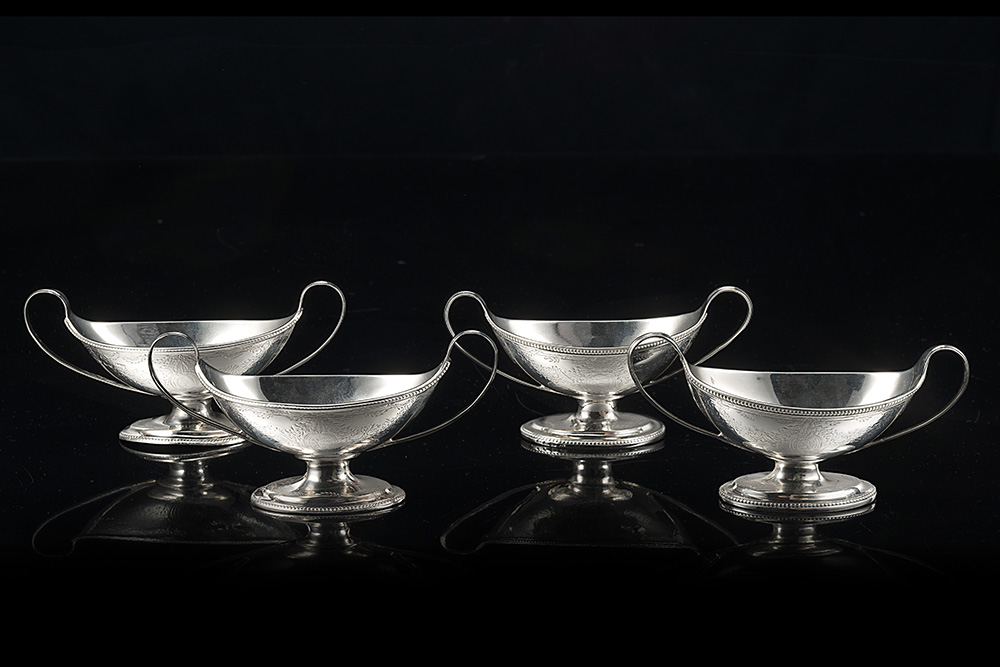 Coppia di saliere biansate in argento. Inghilterra, 1786. Unito a un'altra coppia di simile decorazione ma di epoca posteriore (g 350 ca.)