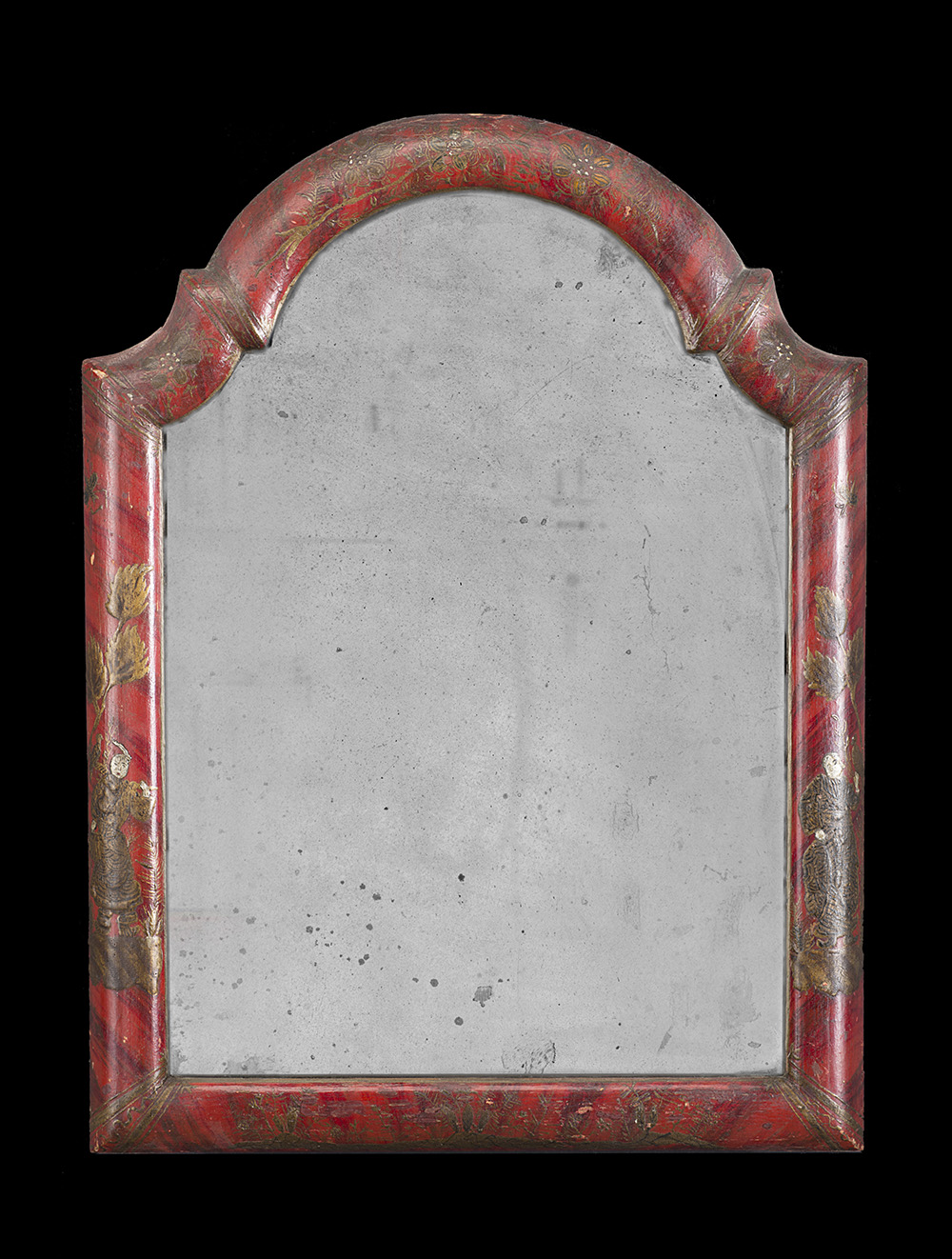 Specchierina di forma sagomata in legno laccato a fondo rosso e decorata a chinoiserie in oro a figure e motivi vegetali. Venezia, fine secolo XVIII (cm 50x38) (lievi restauri)
