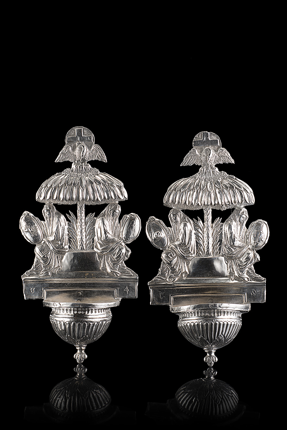 Coppia di acquasantiere in argento raffiguranti allegorie delle virtù cardinali sotto un albero di palma