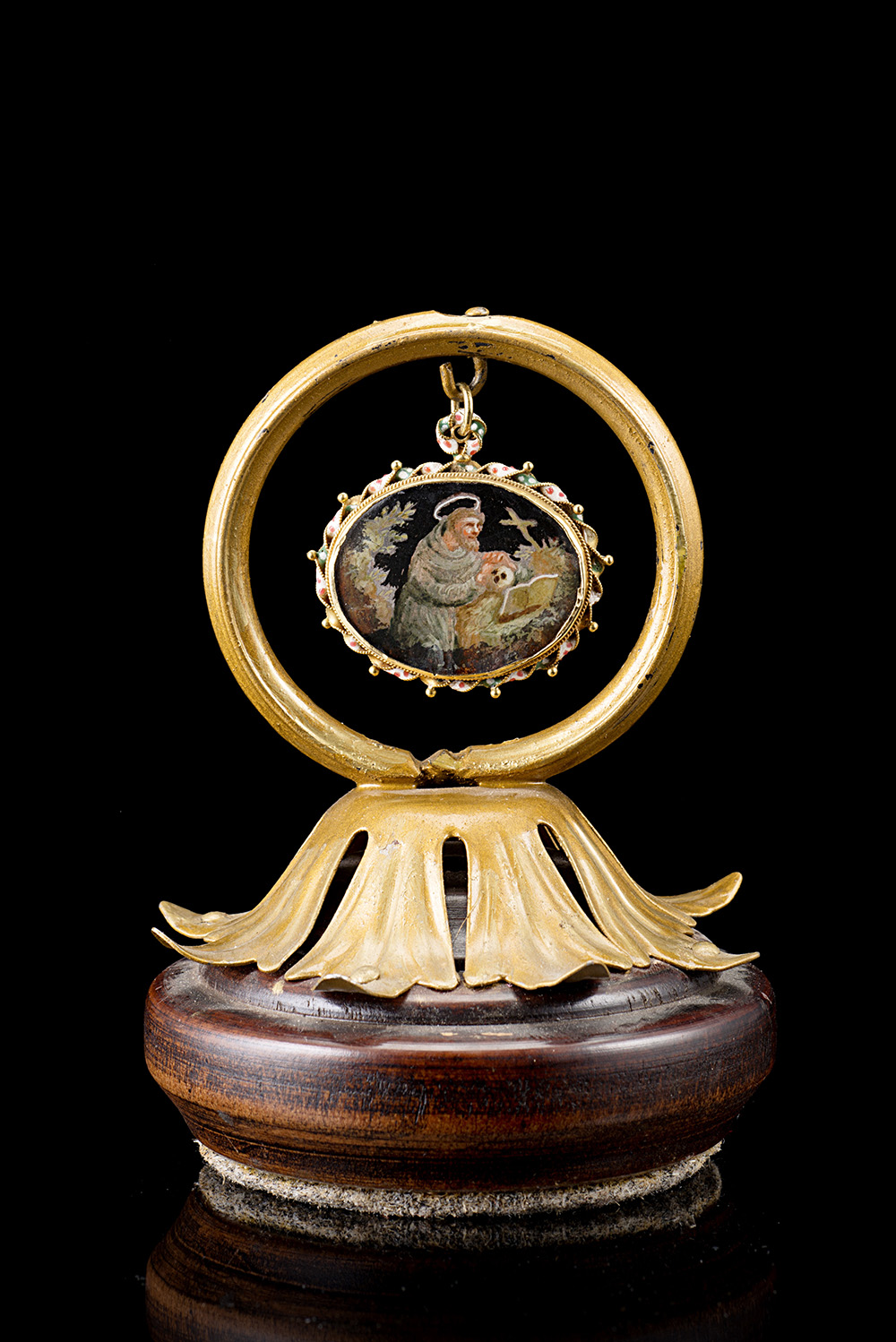 A 18th-century pendant with gold and enamels frame, depicting Saints in prayer (cm 3x3,5) On base of a later date (defects)